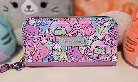 The features of this wallet include: 12 credit card slot pockets, 2 bill pockets, 2 open pocket areas for receipts as well as a full depth center zippered pouch. There is also a removable wristlet strap.